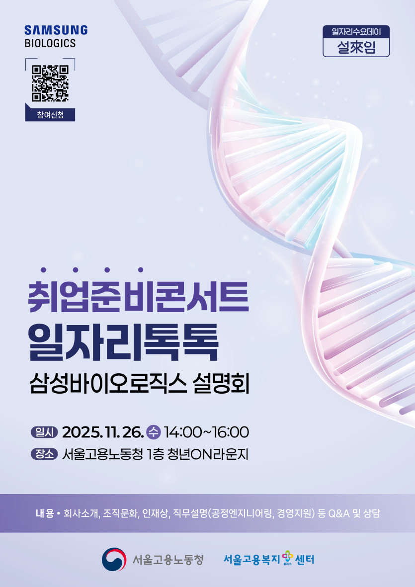 공지사항 서울고용노동청과 함께하는 취업준비콘서트_일자리톡톡(삼성바이오로직스) 홍보