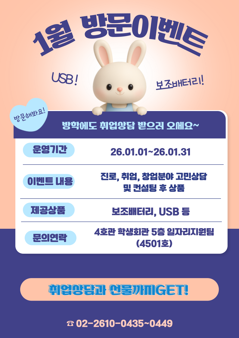 뉴스레터/공지사항 목록 공지 [일자리지원팀(대플) 방문이벤트] 2026학년도 01월 취업상담브릿지프로그램 운영 안내 2시간 5분전 - 첨부파일 : 01월.png (241.4K) - 다운로드 1 2025-12-31 09:30:47 본문 [일자리지원팀(대플) 방문이벤트] 2026학년도 01월 취업상담브릿지프로그램 운영 안내